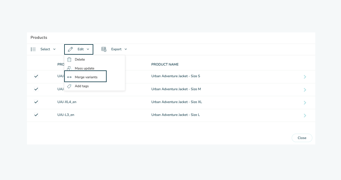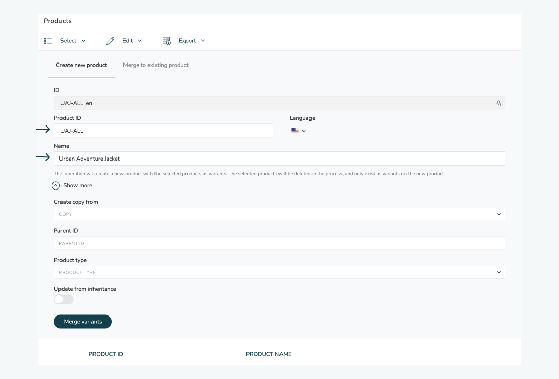 - If the selected products already have variants, these will be added to the main product as new variants.