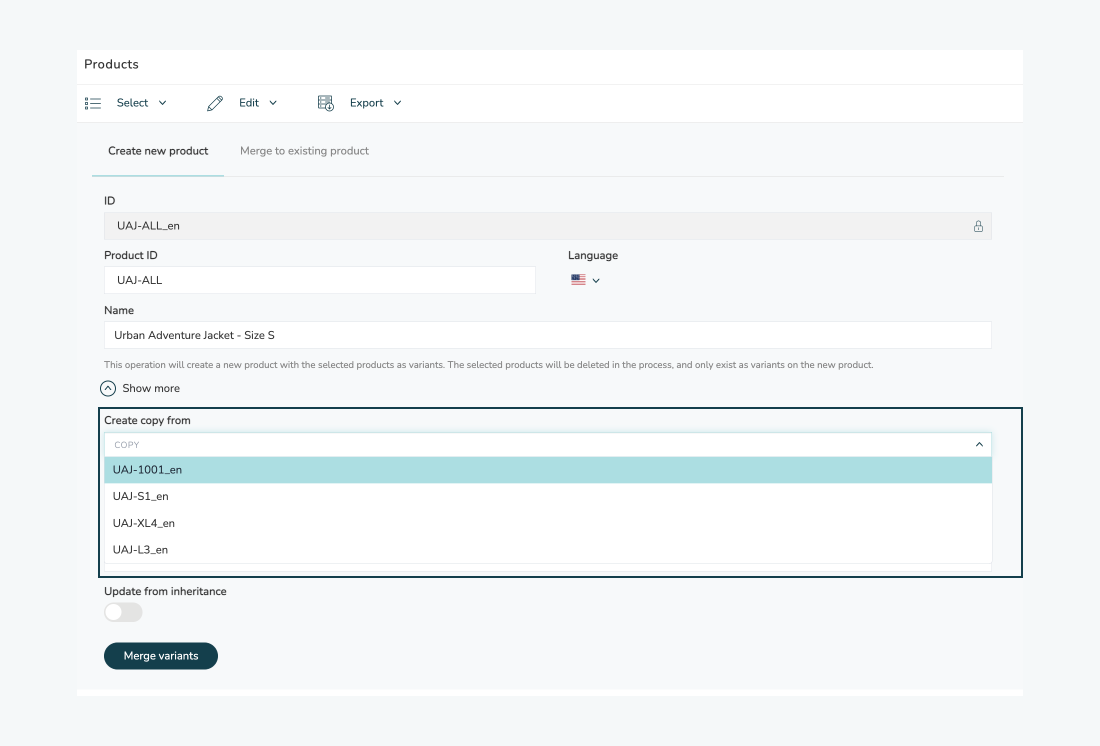 - Once the new product is created, all other information (such as descriptions and images) will be empty. To copy data from one of the variants to the main product, select "create copy from" in the dropdown menu.