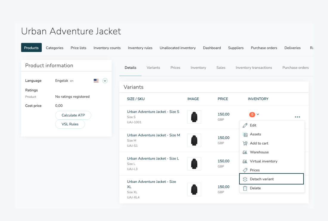 If you want to correct an error or make a variant its own product, you can detach the variant from the main product.
