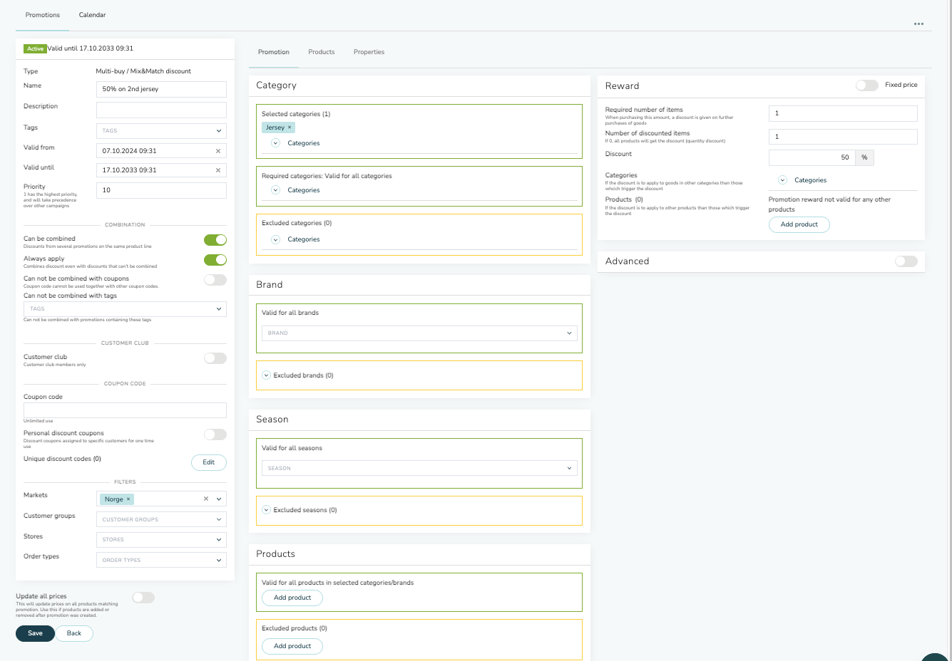 This guide shows how to set up a multi-buy promotion where customers receive a discount when purchasing multiple items. In this case: buy 2 jerseys and get 50% off the second.