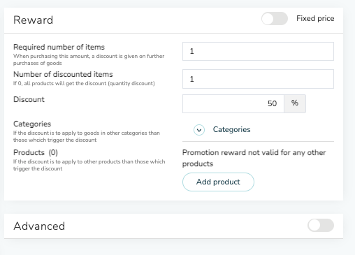 50%Categories and Products under Reward: Leave empty unless you want the discount to apply to a different category or product than the one triggering it.