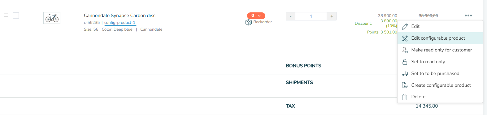 IsConfigurableProducton the order line indicates whether it represents a configurable productThis value is automatically set when a configurable product is created from the cart