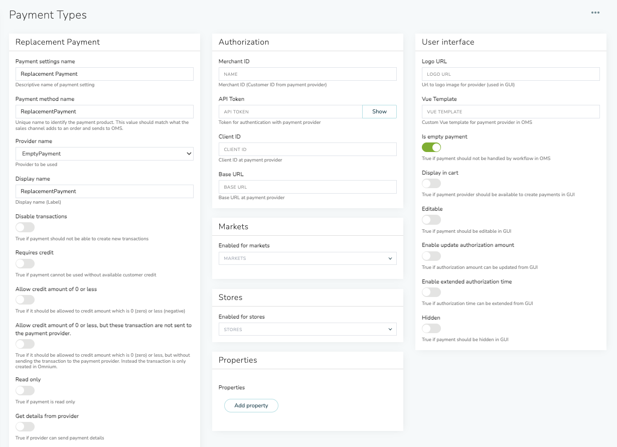 providerNameis set to EmptyPayment since no actual payment transaction should be made.displayInCartis false so the method will not appear as an option at checkout.hiddenis true, meaning the method is only used internally for replacement processes.- This payment method should only be used when creating replacement orders.