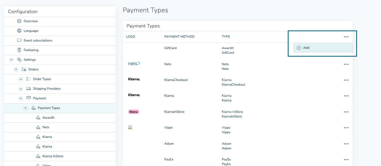 - Go to the payment methods configuration. Configuration -> orders -> payment types