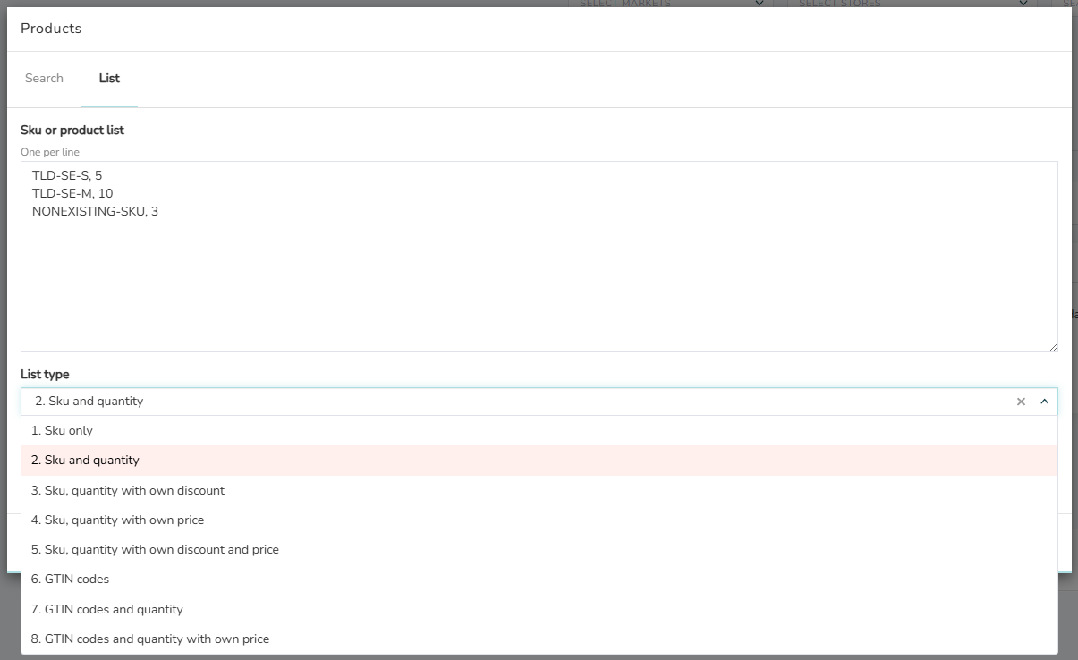 You can also add quantity in this step or later on. Use a comma for separating the quantity from the SKU/GTIN.