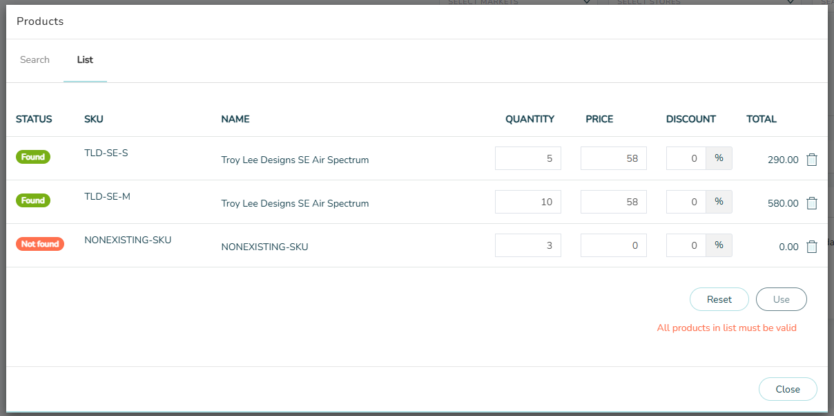 After clicking search you must remove any products that weren't found before proceeding by clicking Use. The Reset button can be used to start over.