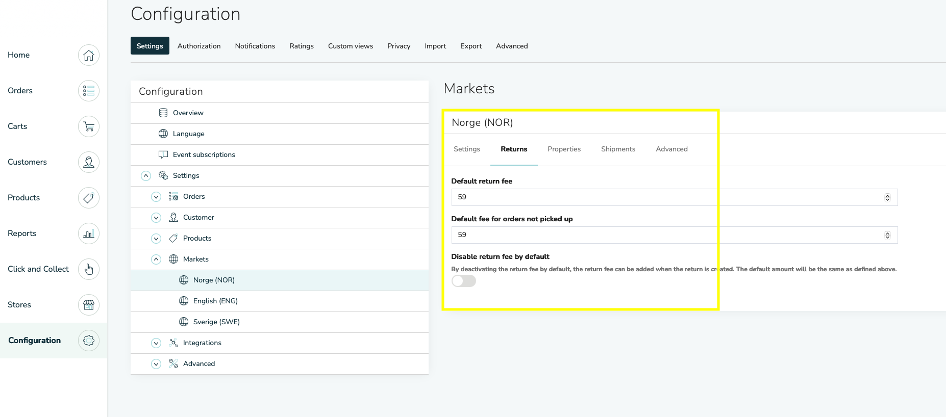 Go to Configurations → Markets → Choose a market → Returns