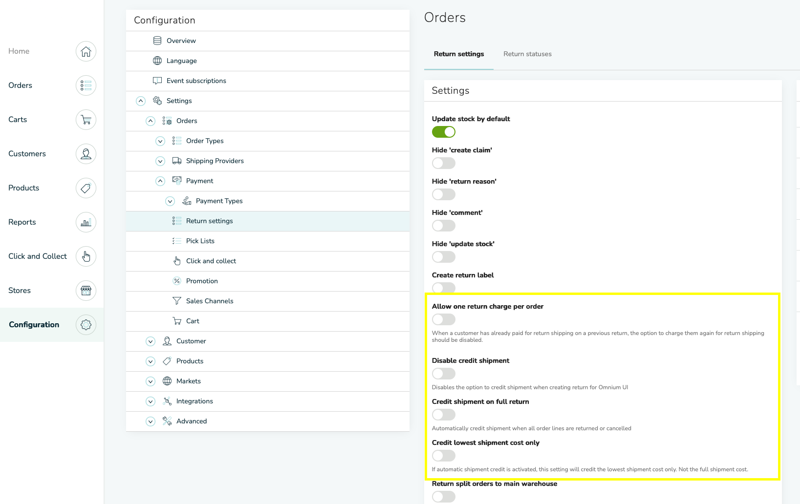 Go to Configurations → Orders → Return settings