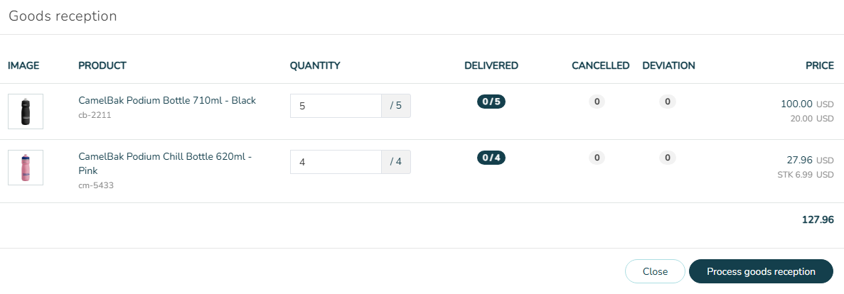 - The goods reception modal uses counted quantities instead of ordered quantities