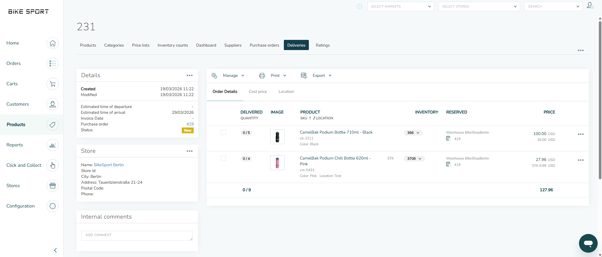 Left side — Delivery Information including details, store, comments, notes, and supplier.