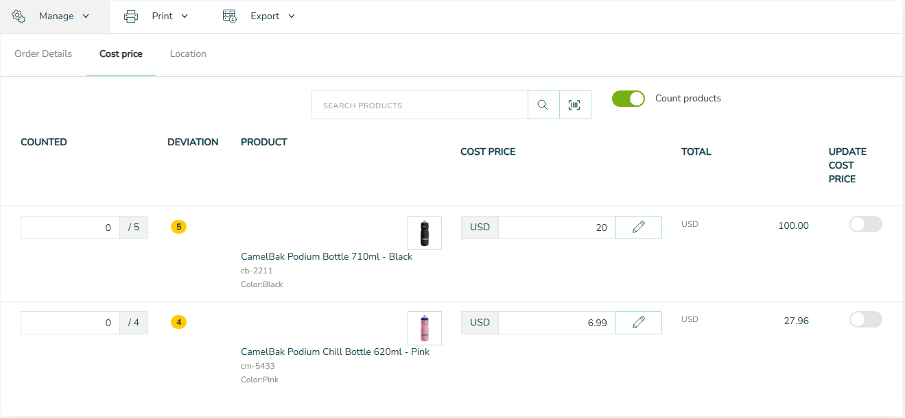 - (Optional) Enable Count Products on the Cost Price tab and scan/count products